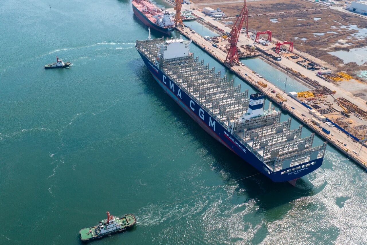4月1日,中船大连造船大船天津为达飞集团建造的甲醇双燃料集装箱船C16K-17号船圆满完成甲醇燃料试航任务,顺利停靠码头。