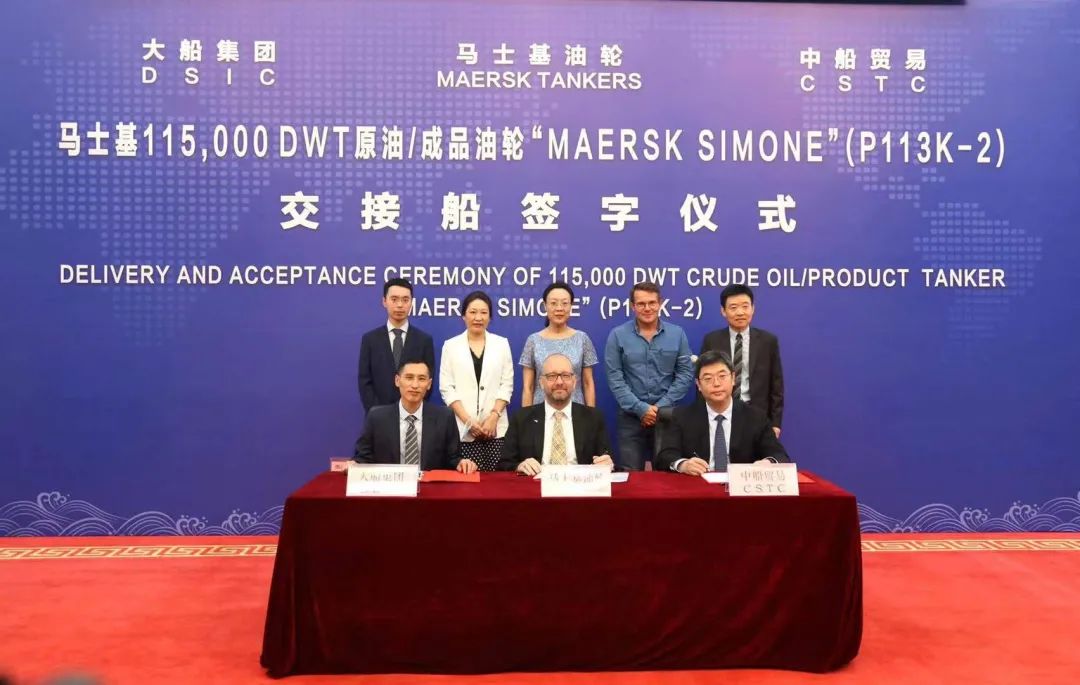 8月18日,中国船舶大船集团为马士基油轮建造的11.5万吨原油/成品油船2号船“MAERSK SIMONE”轮(船编号:P113K-2)签字交工。