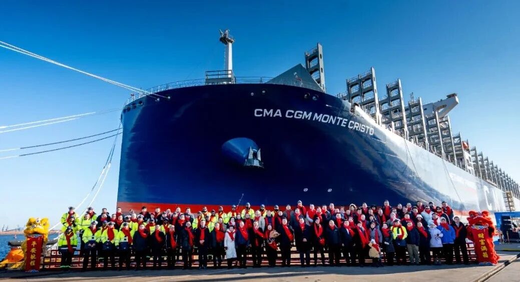 1月21日,由中船大连造船大船天津为法国达飞集团建造的华北地区首艘甲醇双燃料15000TEU集装箱船“CMA CGM MONTE CRISTO”轮(C16K-16)举行隆重命名交付仪式。