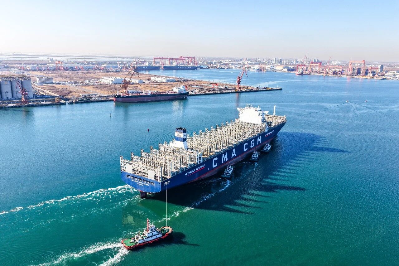 大船天津首制甲醇双燃料15000TEU集装箱船甲醇燃料试航凯旋